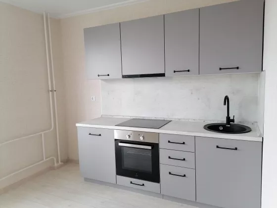 На кухне установлен кухонный гарнитур со всей необходимой техникой: варочная поверхность, духовой шкаф, вытяжка всё новое и добротное. Хороший смеситель и стильная раковина, на мебели дорогая фурнитура. Сан/узел - с сантехникой.