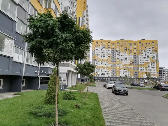 Большое расстояние между домами, много места для парковки автомобилей, также есть многоуровневая стоянка. Двор с красочными детскими и спортивными площадками , скамейками для отдыха и зелеными кустарниками и деревьями.