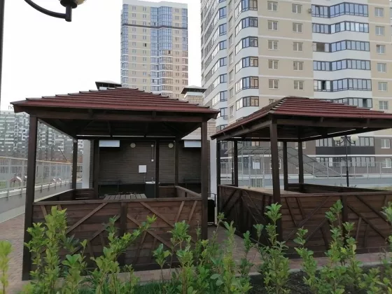Дизайнерская входная группа, три скоростных лифта, есть консьерж и колясочная зона. Стилобат, с парковкой и большой детской площадкой на которой расположено футбольное и баскетбольное поле, спортивная зона и уютные беседки с мангалом.