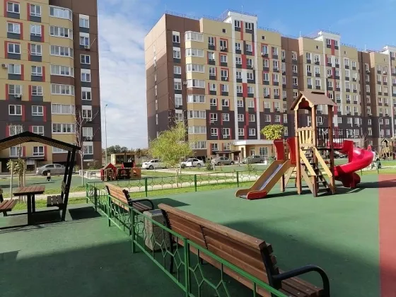 Большое расстояние между домами, много места для парковки автомобилей. Зелёный двор с красочными детскими и спортивными площадками, скамейками для отдыха и красивыми кустарниками , молодыми деревьями.