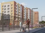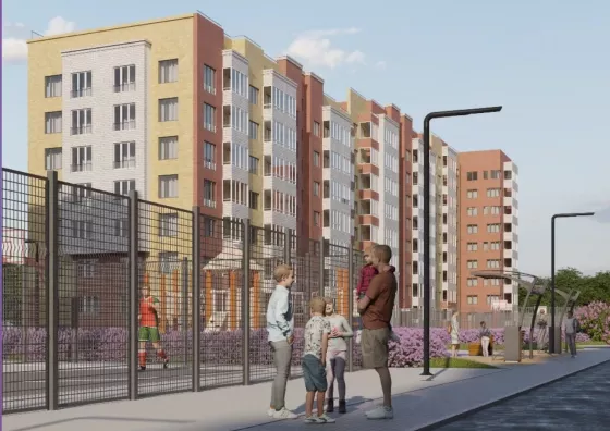 Современный малоэтажный жилой комплекс, дома монолит- кирпич, закрытая территория, двор без машин, парковочные зоны для авто, на первом этаже магазины.