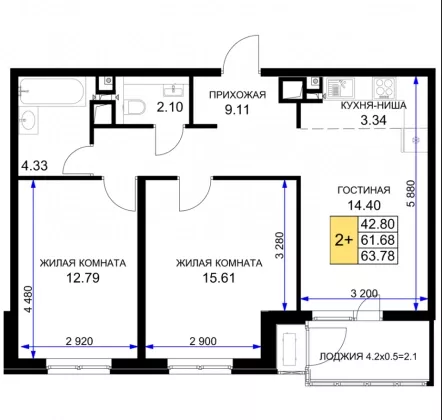 Продается 2-х комн. новостройка, 63.78 кв.м., 9/16 эт