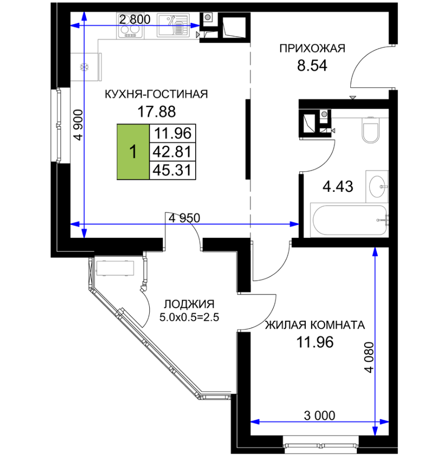 Продается однокомнатная новостройка, 45.31 кв.м., 12/16 эт