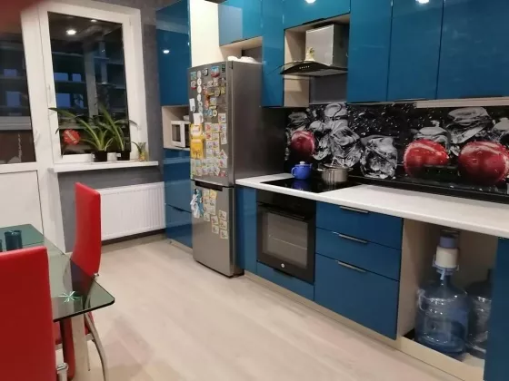 Выход из кухни на лоджию с видом во двор. В квартире продумано всё до мелочей, грамотно сделана разводка электричества, установлены дополнительно подсветки и светильники, сделана трасса под сплит систему.