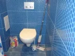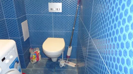 В ванной комнате установлена инсталяция, ванна, раковина и навесная тумба, качественно уложена плитка.