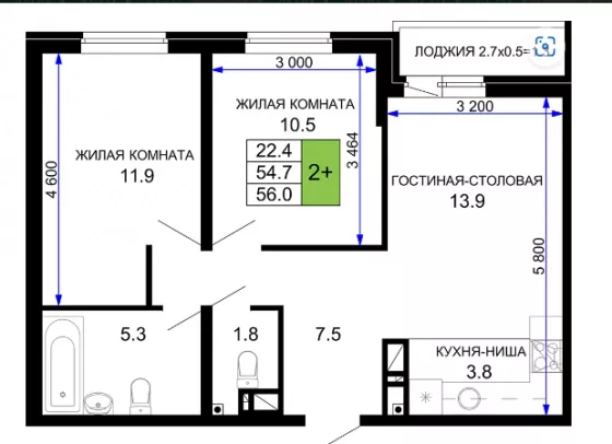 Продается 2-х комн. новостройка, 56 кв.м., 15/16 эт