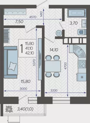 Продается однокомнатная новостройка, 42.1 кв.м., 2/12 эт