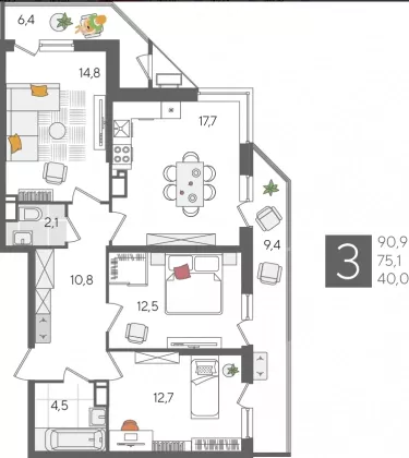 Продается 3-х комн. новостройка, 90.9 кв.м., 17/24 эт