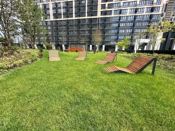 Ландшафтный дизайн всего комплекса, современные детские площадки с тематическими Арт-объектами и фонтаном, прогулочные зоны, футбольная и волейбольные площадки.