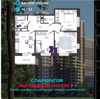 Продается 3-х комн. новостройка, 63.5 кв.м., 10/24 эт