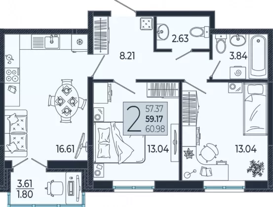 Продается 2-х комн. новостройка, 60.98 кв.м., 15/21 эт