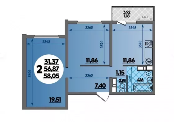 Продается 2-х комн. новостройка, 58.05 кв.м., 7/16 эт