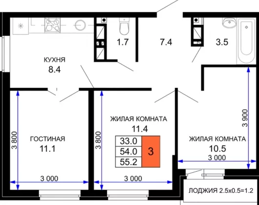 Продается 3-х комн. новостройка, 55.2 кв.м., 8/16 эт