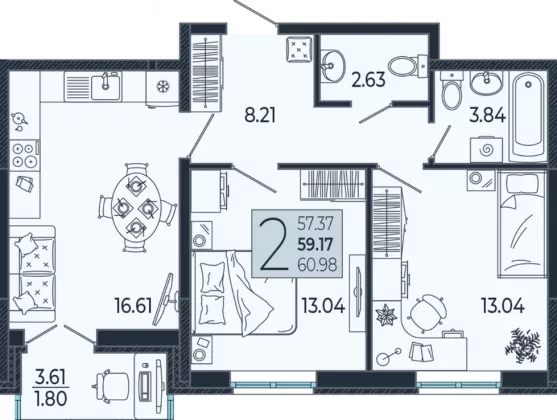 Продается 2-х комн. новостройка, 60.98 кв.м., 15/21 эт