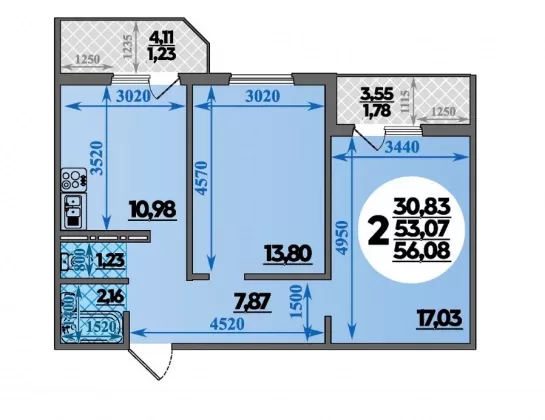 Продается 2-х комн. новостройка, 56.08 кв.м., 6/16 эт