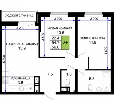 Продается 2-х комн. новостройка, 56 кв.м., 9/16 эт