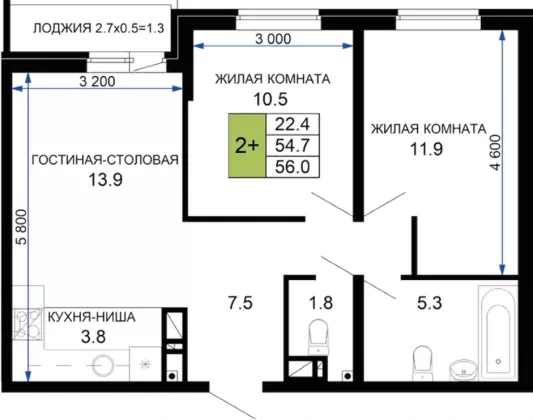 Продается 2-х комн. новостройка, 56 кв.м., 11/16 эт