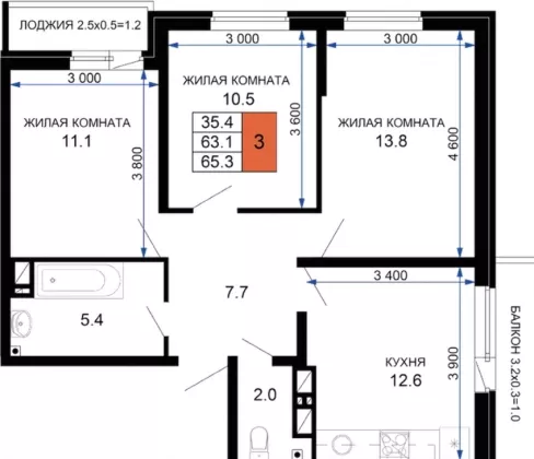 Продается 3-х комн. новостройка, 65.3 кв.м., 12/16 эт