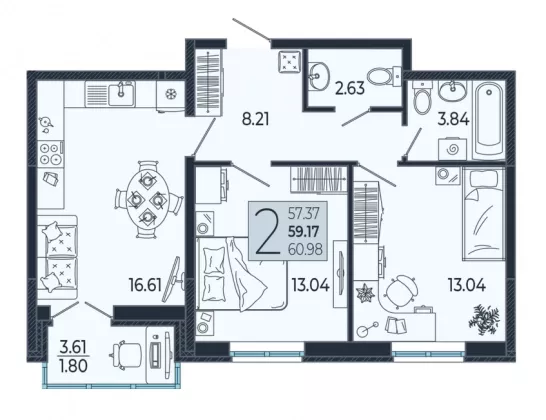 Продается 2-х комн. новостройка, 60.98 кв.м., 15/21 эт
