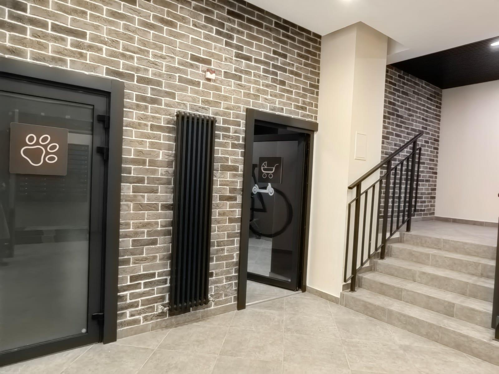 Колясочные и боксы для велотранспорта, лапомойки для питомцев, туалеты.