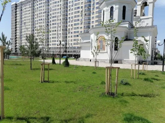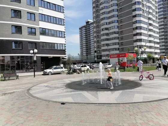 Красивые входные группы, два лифта, большая прогулочная аллея с фонтаном и с скамейками для отдыха. Много зелени кустарников и красивых деревьев. Во дворе стилобат, первый уровень стилобата это парковки для авто, второй уровень для отдыха взрослых и детей: мангальные зоны с беседками и лавками , игровые площадки футбольные и баскетбольные поля.