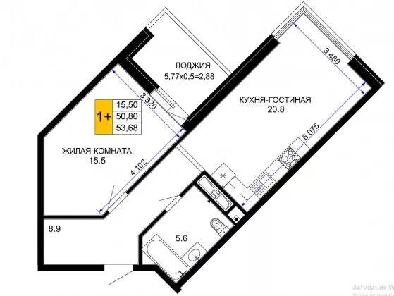 Продается однокомнатная новостройка, 53.68 кв.м., 4/12 эт