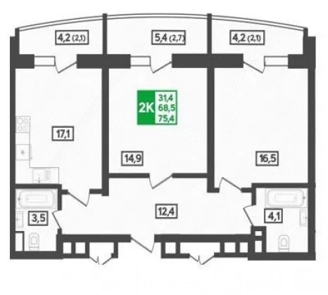 В квартире продуманная планировка, просторная кухня-гостинная, комнаты правильной формы, два сан.узла, из каждой комнаты выход на балкон.