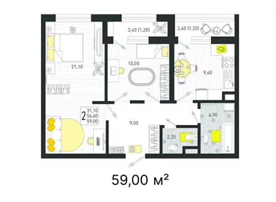 Планировка с большой комнатой 21кв метр и с просторным раздельным санузлом!
