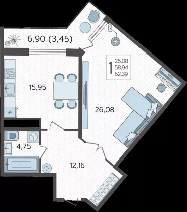 Квартира в шикарном жилом комплексе, планировка с большой комнатой и просторной кухней-гостиной и ленточной лоджией!