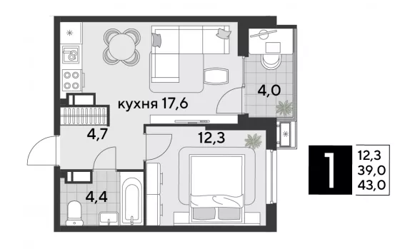 Продается однокомнатная новостройка, 43 кв.м., 9/18 эт