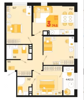 Продается 3-х комн. новостройка, 74.6 кв.м., 11/18 эт