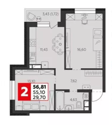 Продается 2-х комн. новостройка, 56.81 кв.м., 4/8 эт
