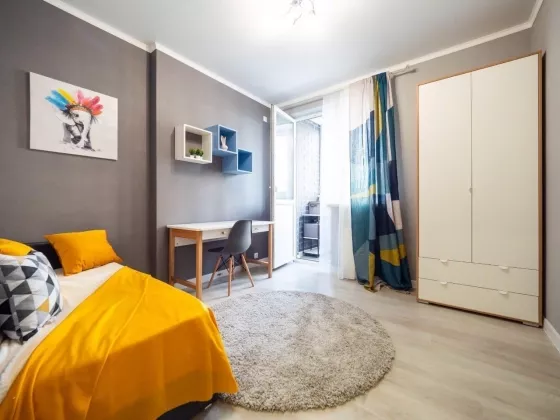 В квартире качественная отделка, просторная комната, балкон застеклен в едином стиле, 4 квартиры на этаже, два бесшумных лифта.