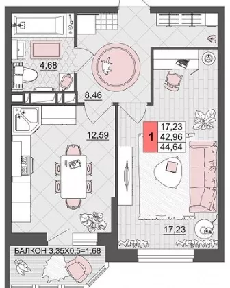 Продается однокомнатная новостройка, 44.65 кв.м., 15/19 эт