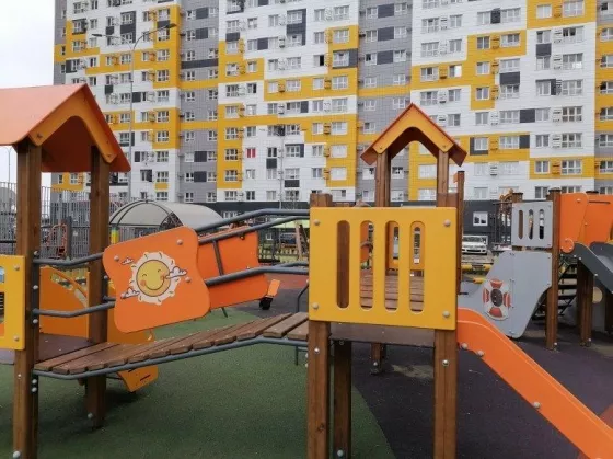 Большое расстояние между домами, много места для парковки автомобилей, также есть многоуровневая стоянка. Двор с красочными детскими и спортивными площадками, скамейками для отдыха и зелеными кустарниками и деревьями.