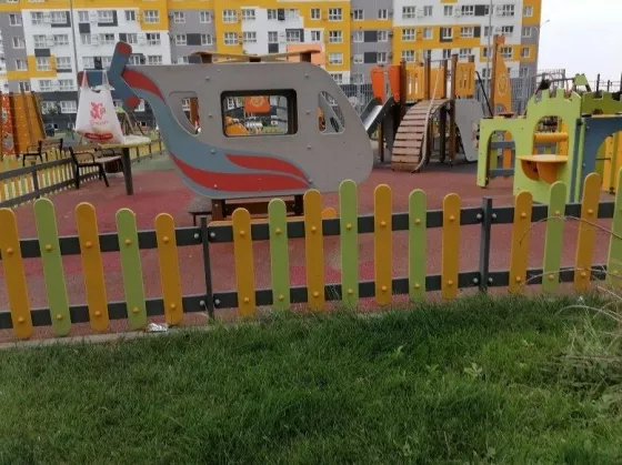 Большое расстояние между домами, много места для парковки автомобилей, также есть многоуровневая стоянка. Двор с красочными детскими и спортивными площадками, скамейками для отдыха и зелеными кустарниками и деревьями.