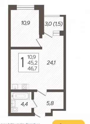 Продается однокомнатная новостройка, 46.7 кв.м., 7/8 эт