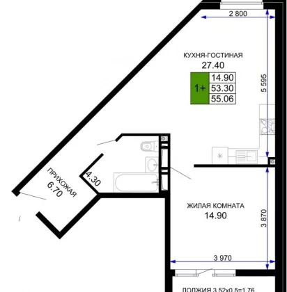 Продается однокомнатная новостройка, 55.05 кв.м., 8/12 эт