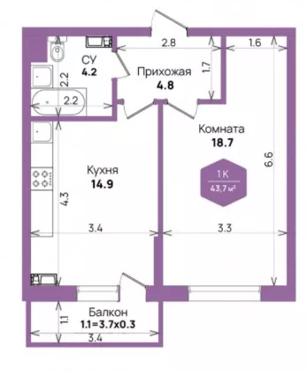 Продается однокомнатная новостройка, 43.7 кв.м., 17/21 эт