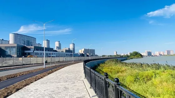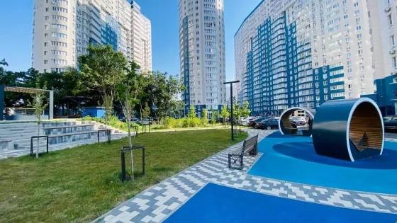 - ЖК расположен в Центральном окpугe г. Краснодар на берегу p.Kубaнь.