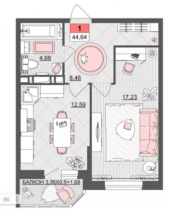Продается однокомнатная новостройка, 44.64 кв.м., 19/19 эт
