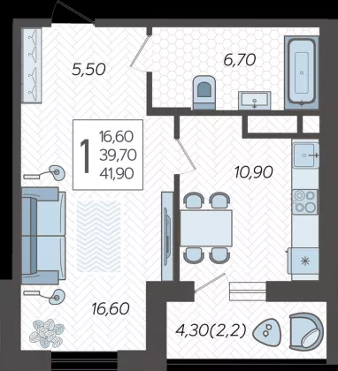 Продается однокомнатная новостройка, 41 кв.м., 7/16 эт