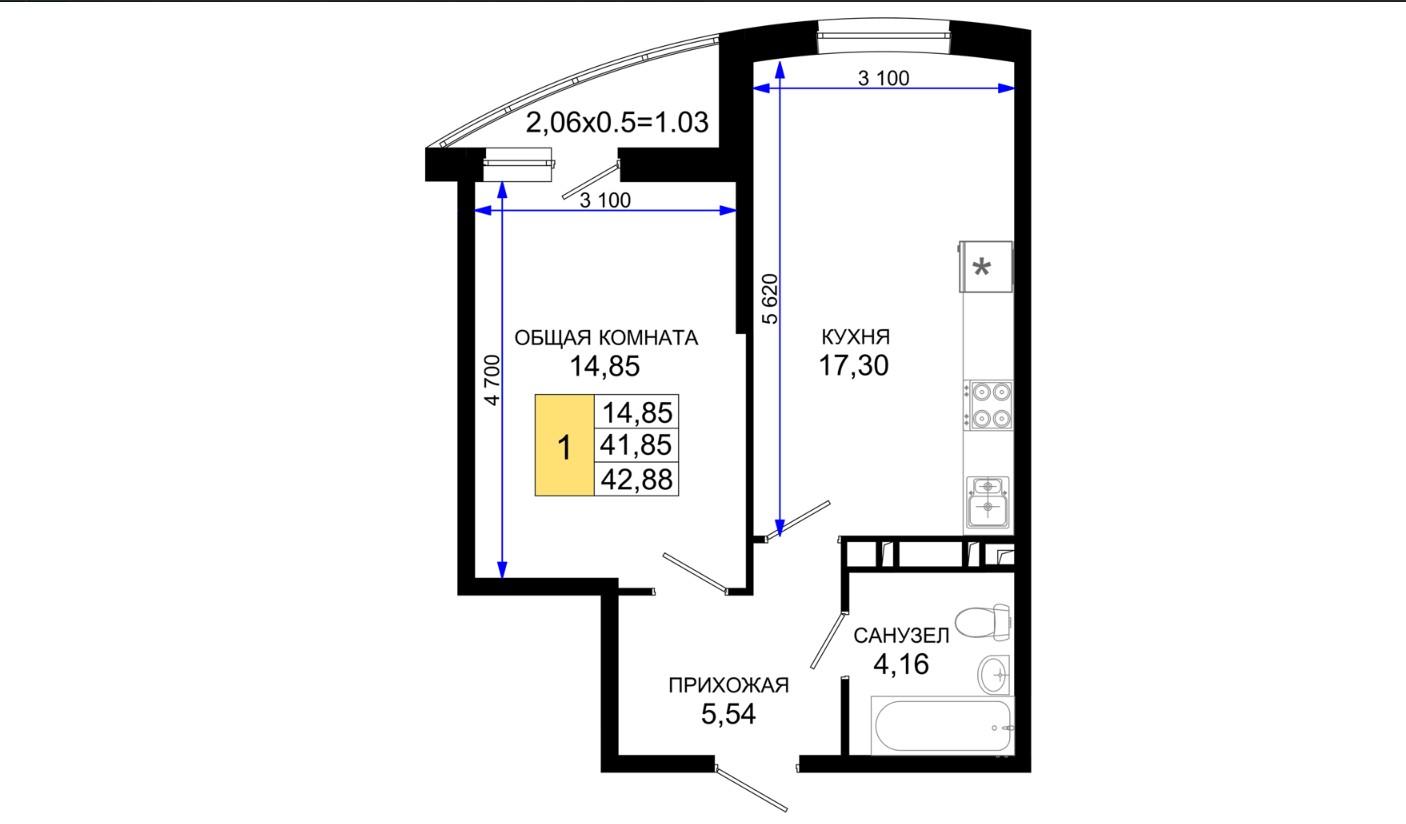 Продается однокомнатная новостройка, 44 кв.м., 11/18 эт