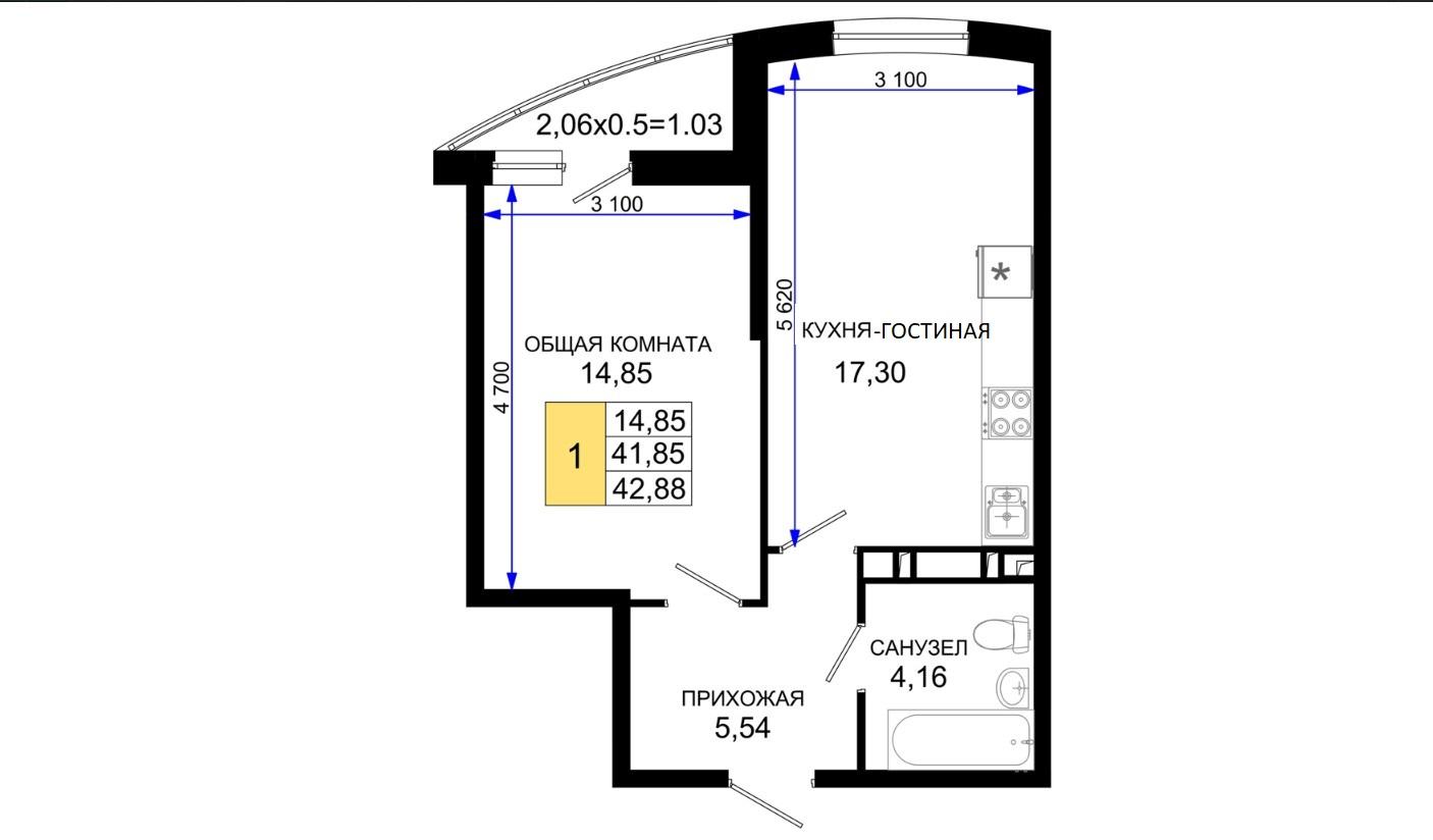 Продается однокомнатная новостройка, 46 кв.м., 5/21 эт
