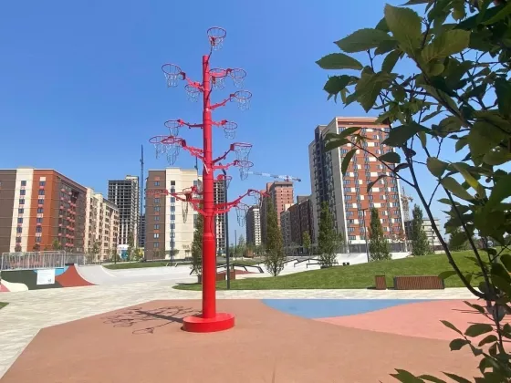 колясочная зона и помывочная для лап собачек .так же есть площадки для собак. продуманный ландшафтный красочные детские площадки и, много зелени и свежего воздуха.