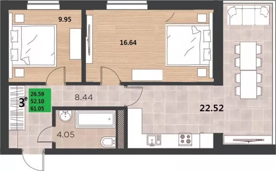 | Площадь, кв.м. | 61 |