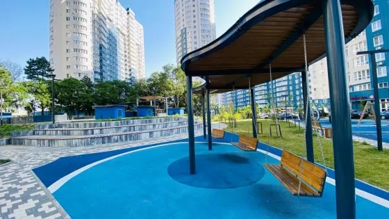 - ЖК расположен в Центральном окpугe г. Краснодар на берегу p.Kубaнь.