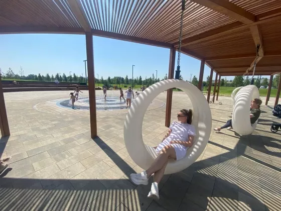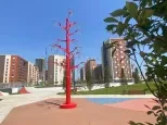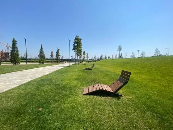 колясочная зона и помывочная для лап собачек .так же есть площадки для собак. продуманный ландшафтный красочные детские площадки и, много зелени и свежего воздуха.