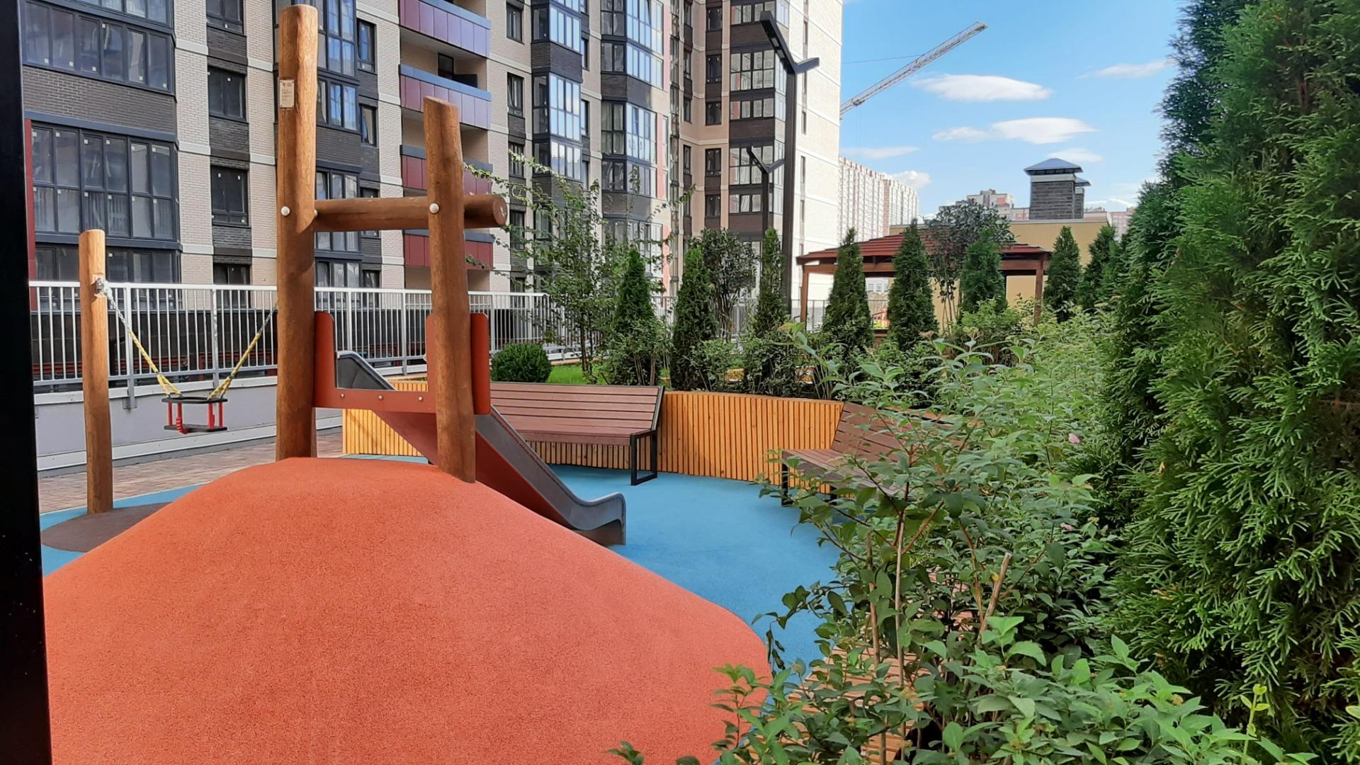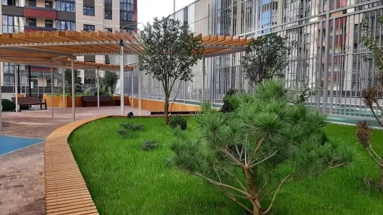 Придомовая территория ландшафтный дизайн,2-х уровневый стилобат,с детскими площадками и зонами отдыха,удобный выезд и города.