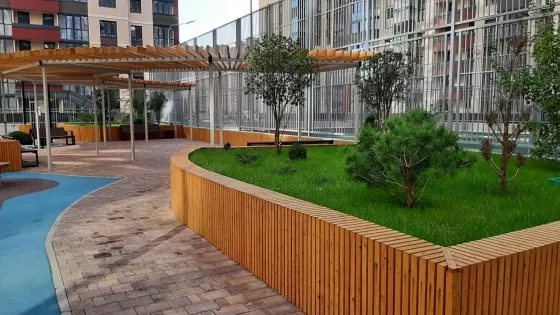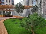 Придомовая территория ландшафтный дизайн,2-х уровневый стилобат,с детскими площадками и зонами отдыха,удобный выезд и города.